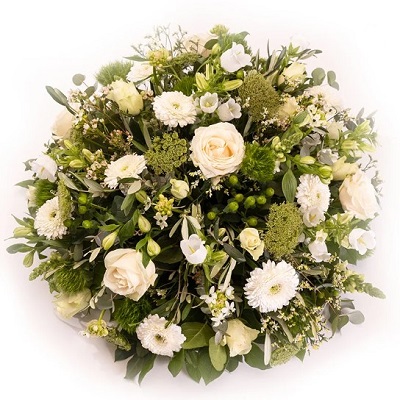 Rond opgestoken rouwstuk in witte en groene tinten met rozen, gerbera’s, alstroemeria’s, anjers en diversen soorten groen.