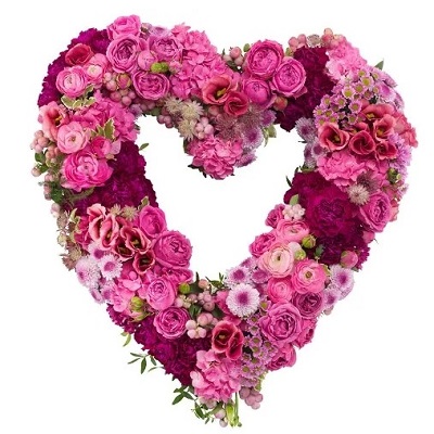 Open rouwhart van roze bloemen. Dit rouwhart is beschikbaar in verschillende varianten van standaard 45-50 cm, middel 50-55 cm of groot 60-65 cm.