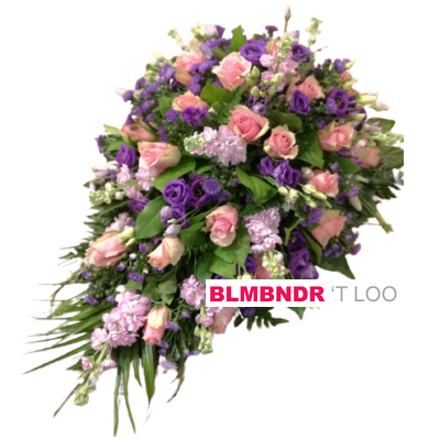 Mooi liefdevol rouwarrangement in de druppelvorm opgemaakt met lila, paars en roze bloemen o.a. roze Roze, Lisianthus, Violieren en diversen soorten groen.
