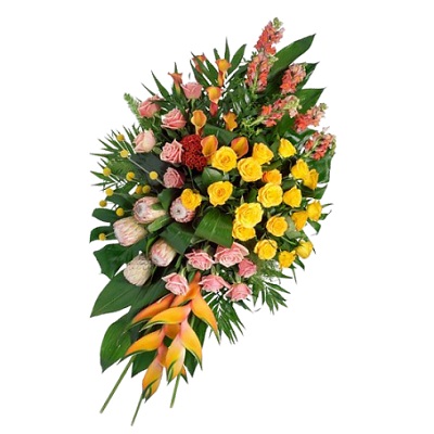 Tropische bloemen en kleuren maken dit rouwstuk tot een exotisch geheel.