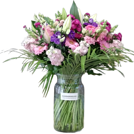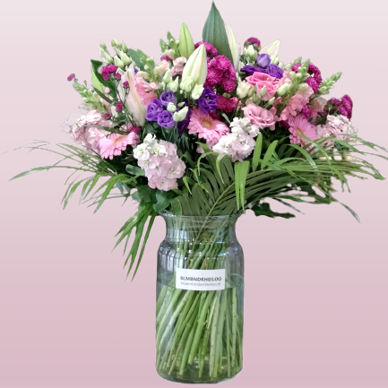 Een zomerse cocktail van roze rozen, zacht roze oriental Lelie’s, roze Germini, roze en paarse Lisianthus en Violieren.